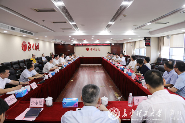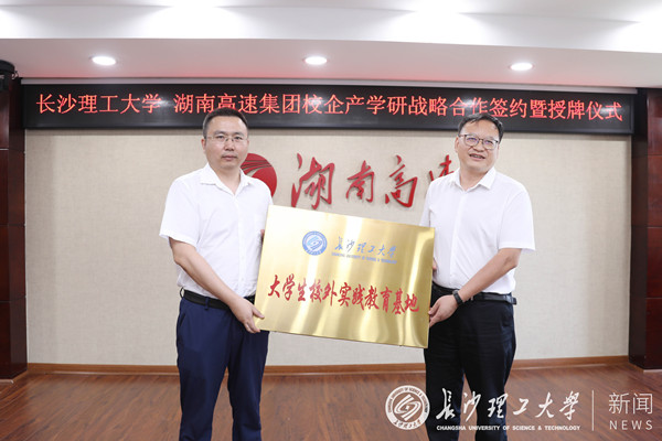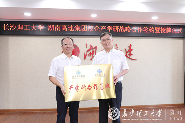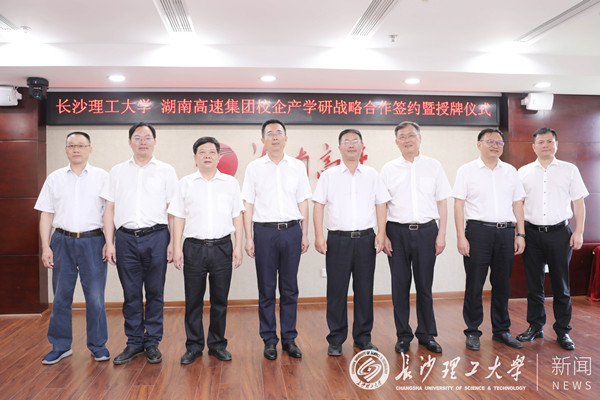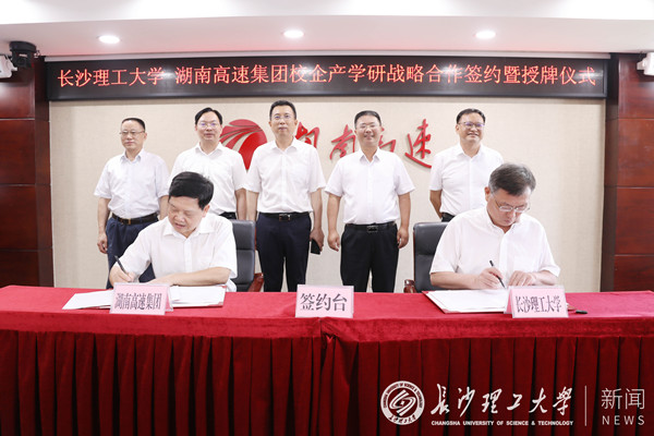 7月7日上午,我校与湖南省高速公路集团有限公司(以下简称湖南高速集团)校企产学研战略合作签约暨授牌仪式在湖南高速集团总部会议室举行。校党委副书记、校长曹一家,党委委员、副校长谈传生、刘朝晖及学校相关职能部门负责人,湖南高速集团党委书记、董事长马捷,党委委员、副总经理王辉扬、罗卫华,总会计师汪小平及集团有关部门负责人共同出席。