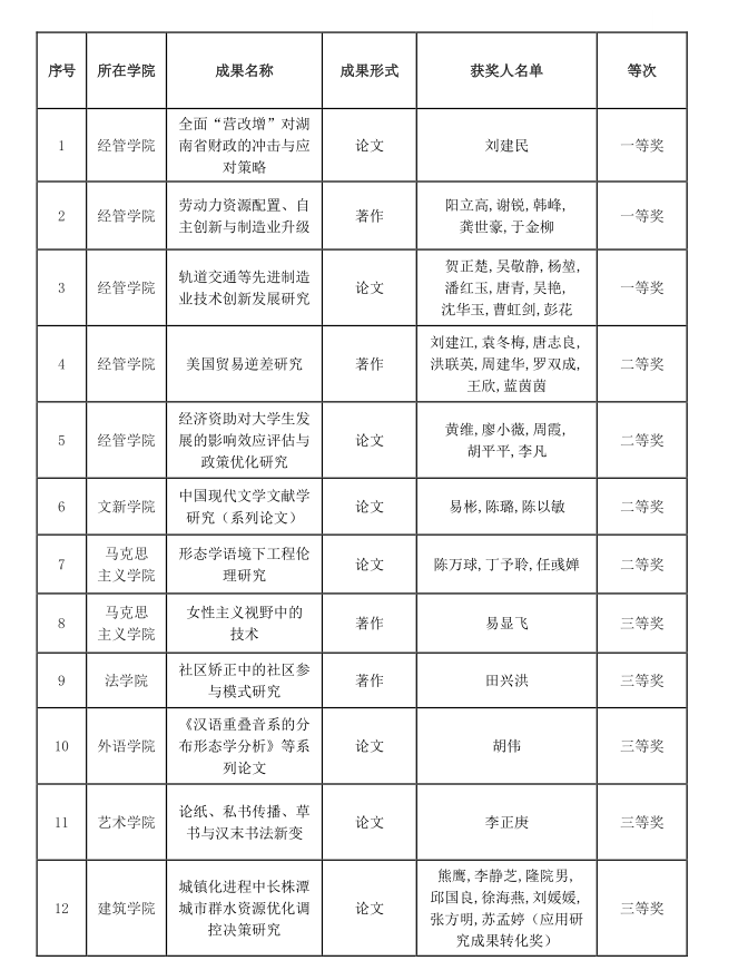 日前,湖南省委、省政府发布了《关于表彰湖南省社会科学奖获奖成果和专家的通报》,公布了第十五届湖南省社会科学优秀成果奖评选结果,我校共12项成果获奖,其中获得一等奖3项,二等奖4项,三等奖5项,总数量较上一届增长1倍。此次获奖成果主要集中于经济、管理、哲学等学科,其中经管学院获奖5项,马克思主义学院获奖2项,文新学院、法学院、外语学院、艺术学院、建筑学院各获奖1项。