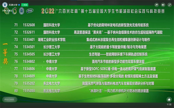 本届竞赛以“节能减排,绿色能源”为主题,共吸引了来自清华大学、西安交通大学、天津大学、浙江大学等全国589所高校提交的6218件作品参赛,参赛学生数量、参赛作品数量、参赛高校数量三项数据也再创新高。经专家组评审会议,通过网评共选出2072件获奖作品进入会评,最终评出特等奖10项(0.16%),一等奖138项(2.22%),二等奖227项(3.65%),三等奖1164项(18.72%)。