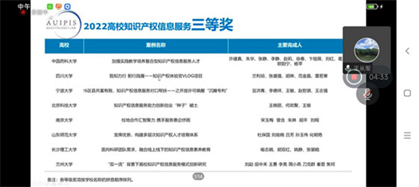 高校知识产权信息服务中心联盟(AUIPIS)2022年年会暨第五届学术研讨会于11月23日-25日在福州召开。会议公布了“2022高校知识产权信息服务”优秀案例评选结果,我校报送的案例《面向科研团队需求、融合线上线下的知识产权信息素养教育》荣获三等奖。