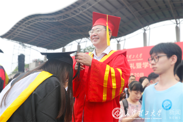 毕业典礼后,校领导和导师代表为全体毕业生一一拨穗正冠并颁发学位证书。