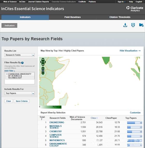 我校工程学、材料科学、化学、计算机科学、数学、环境/生态学6个学科影响力进入ESI全球排名前1%。