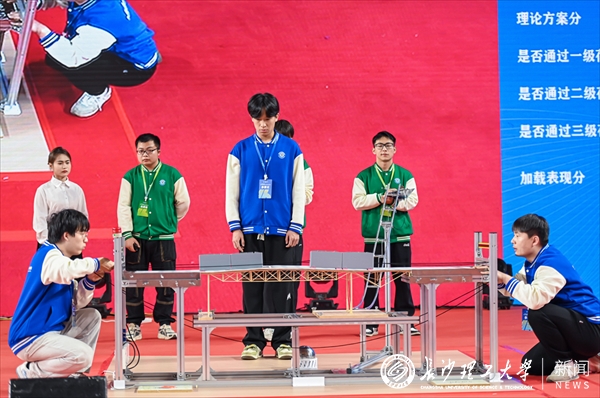 长理学子在第十六届全国大学生结构设计竞赛决赛现场进行模型加载测试。