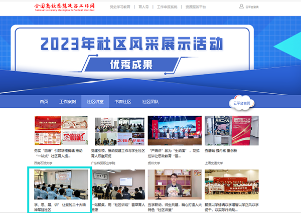 日前,经高校推荐、专家评审等环节,教育部择优遴选出160个高校“一站式”学生社区风采展示活动优秀成果,我校推荐的《“学、思、展、讲”让党的二十大精神常驻社区》被评为2023年社区风采展示“社区讲堂”优秀成果,并纳入全国高校思想政治工作网资源库,在“一站式”学生社区综合管理模式建设工作云平台进行集中展示。