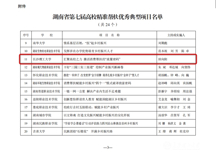 7月26日,湖南省教育厅公布了第七届全省高校精准帮扶优秀典型项目评选结果,我校乡村振兴驻村工作队报送的《汇聚高校之力 激活消费帮扶的“流量密码”》项目成功入选。这是学校立足高校优势特色,积极响应国家乡村振兴战略,创新性开展定点帮扶工作获得的又一项荣誉。