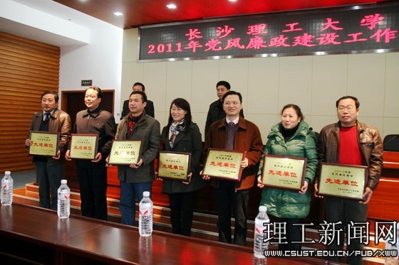 会上,还对2010年度我校党风廉政建设先进单位进行了表彰。2010年,电气与信息工程学院、土木与建筑学院、物理与电子科学学院、化学与生物工程学院、文法学院、水利工程学院、后勤服务集团公司等7个单位获党风廉政建设先进单位荣誉称号。
