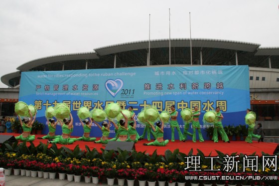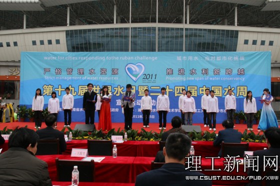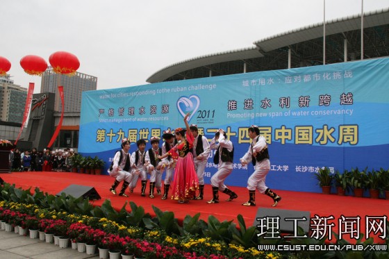 我校学生以“大禹之子”为代表,在活动现场进行了精彩的文艺表演,《爱莲说》用曼妙的舞姿向我们诉说湘江的美丽与故乡的富饶,《青春office》以舞蹈的形式,展示了在校学生的青春风貌。水利学院学生的原创诗朗诵《植绿护水 和谐兴湘》,同学们发自肺腑的真情,诵出了湖湘儿女保护母亲河势在必行的拳拳之心,获得了在场观众的热烈掌声。《让我们舞起来》节奏轻快的音乐、绚丽多彩的服装、富有活力的动作将全场的气氛推到了顶点。老同志们的书画表演为本次宣传活动划上了圆满的句号。