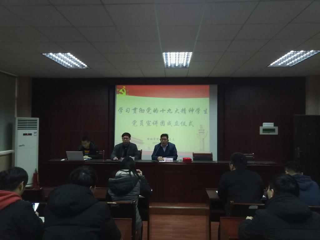 为深入贯彻落实学校《关于认真学习宣传贯彻党的十九大精神的通知》要求,在学院兴起学习宣传贯彻党的十九大精神热潮,15日下午,能动学院在工科一号楼A-428报告厅举行了学习贯彻党的十九大精神学生党员宣讲团成立仪式,将走进班级、食堂和学生宿舍,全面宣讲十九大精神。校宣讲团成员、马克思主义学院副院长张明海出席,学院党建辅导员李小军与百人宣讲团成员参加成立仪式。