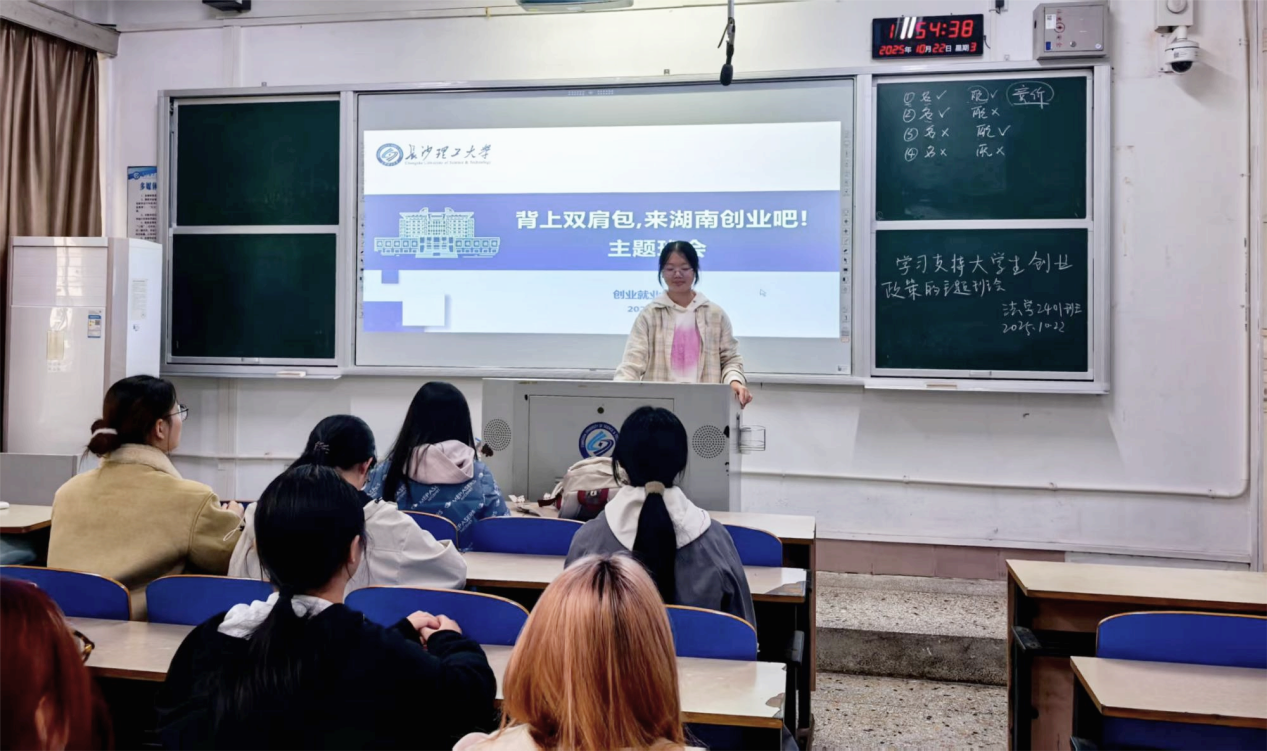 近日,法学院组织全院学生开展以“背上双肩包,来湖南创业吧!”为主题的班会活动。本次班会旨在贯彻落实国家创新创业政策、普及湖南支持创业政策、激发学生创新创业热情。