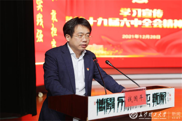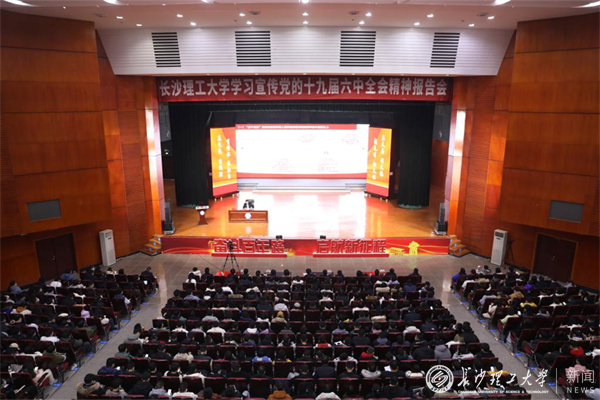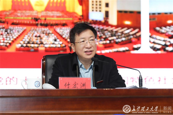 为深入学习宣传贯彻党的十九届六中全会和湖南省第十二次党代会精神,12月28日下午,校党委书记付宏渊在云塘校区大会堂为全校师生作题为《坚定“四个自信” 写好新时代的青春答卷》宣讲报告。报告会由副校长钱国平主持。党委委员、宣传部部长方琼,学校有关部门负责人、全体学工干部参加,并通过网络直播,线上线下超过12000余名学生聆听。