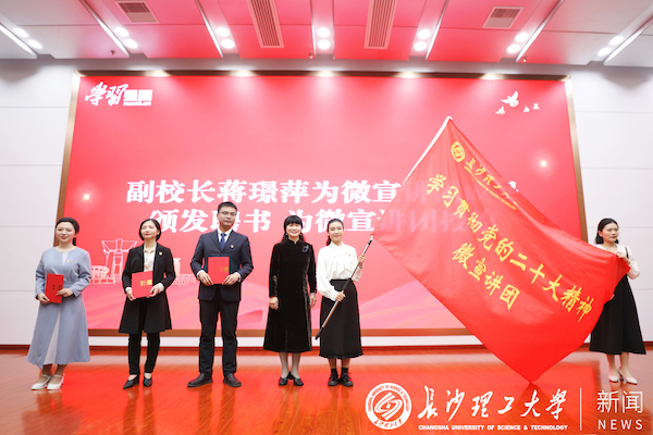蒋璟萍为香港六宝合典资料大全学习贯彻党的二十大精神微宣讲团成员代表颁发聘书,并为微宣讲团授旗。