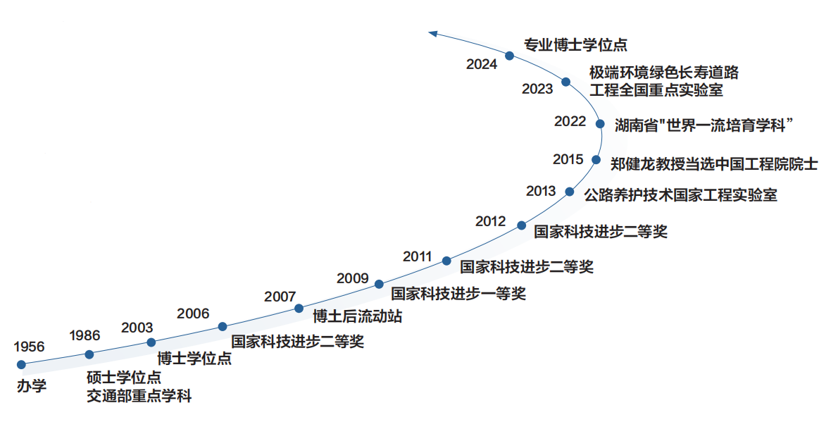 我校交通运输工程学科始于1956年,是我国最早培养公路交通专业人才的学科之一。历经近70年的发展,已建立本-硕-博贯通人才培养体系,2022年入选湖南省“世界一流培育学科”2024年入选湖南省优先支持和重点保障学科。