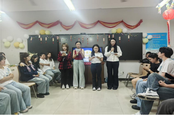 晚会伊始,陈书芳老师登台致辞送祝福,并为同学们送上定制团圆礼。往届毕业学子的视频祝福温情满溢,串联起团队的传承与思念。文艺演出精彩纷呈,舞蹈《鸟儿摇》《幻梦都破碎》、小品《友点意思直播间》、歌曲《最佳损友》等节目轮番上演;诗朗诵《月光下的中国》与大合唱《我爱你中国》更是将现场氛围推向高潮。“你画我猜”“抢椅子”等互动游戏,让师生同台竞技,尽显“一家亲”的融洽氛围。