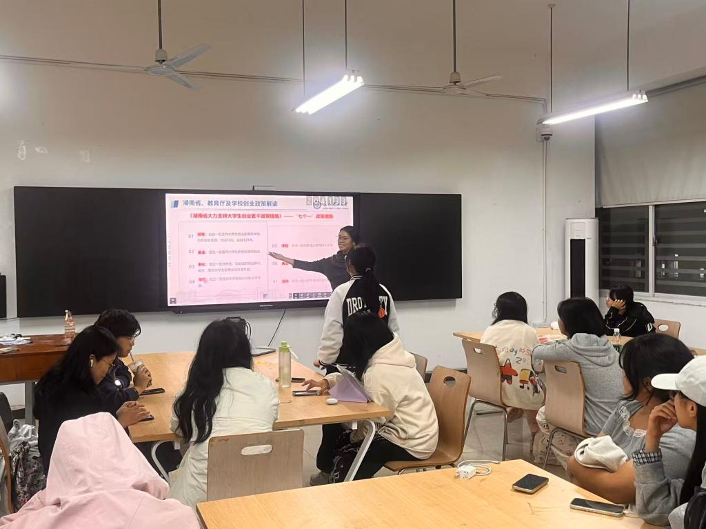 各班主持人解读了《湖南省大力支持大学生创业若干政策措施》的核心内容—“七个一”具体举措,让同学们清晰了解湖南省在创业场地、资金扶持、导师指导、培训体系、服务保障等方面为大学生创业者提供的全方位、立体化支持,坚定了同学们在湘创业的信心。