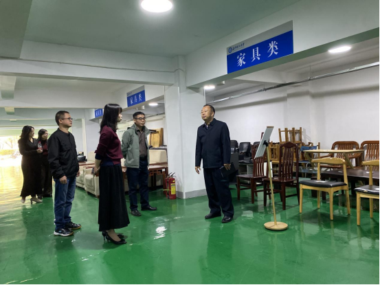 肖爱民一行通过交流座谈、查看实体公物仓、观看公物仓信息平台演示等方式,详细了解了我校公物仓实体仓+虚拟仓建设、日常运行维护等情况。