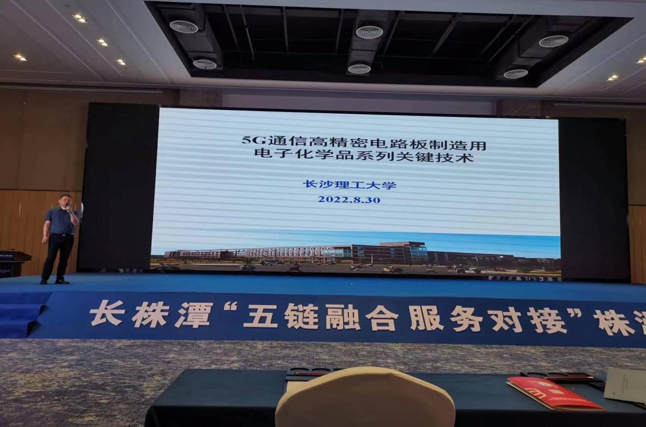 8月30日上午,我校科技成果转移转化中心(知识产权中心)副主任刘亚辉陪同化学化工学院吴道新、肖忠良两位教授到株洲市中国动力谷学术交流中心参加长株潭三市“创新链、产业链、资金链、人才链、政策链五链融合”科技成果对接活动。在对接活动会上,吴道新教授以“5G通信高精密电路板制造用电子化学品系列关键技术”为题作项目路演,该项技术得到了相关企业和投资方的广泛关注,路演结束后,有企业和投资方主动找到吴教授了解该技术的具体情况和留下联系方式。