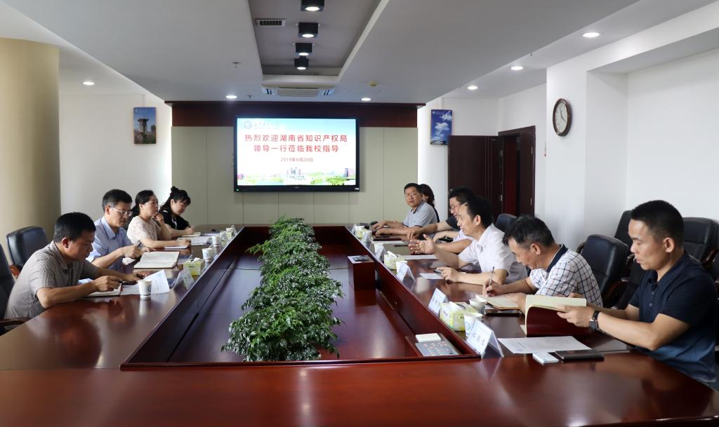 6月28日下午,湖南省知识产权局局长段志雄带领知识产权运用处处长何萍、知识产权运用处副处长周卫、知识产权促进处副处长李涛一行来我校调研知识产权中心建设工作。校长曹一家、副校长杨伟军及科研部、图书馆、成果转化(知识产权)中心相关负责人出席了座谈会。座谈会由杨伟军主持。