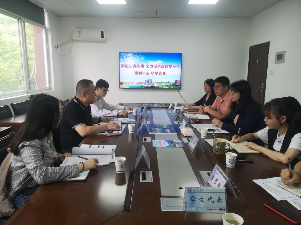 座谈会上,曹瑛处长对杨秋伟专家一行的到来表示热烈欢迎,对我校就业工作好的做法及取得成绩、举办招聘会和提供就业指导服务、课程与专业设置情况进行了介绍;副处长李娜对我校2021届就业形势展开分析,提出相关建议与措施;郑纯老师对我校大学生就业指导课程建设相关内容进行了汇报;宋凯文老师对我校运用“大数据”构建大学生精准就业服务体系,达到高校智慧就业的做法进行了介绍;化学学院兰贵辉老师结合学院就业工作实际谈了体会,提出了就业工作中面临的困难和存在的问题;学生代表分享了就业过程中的感悟、感想。