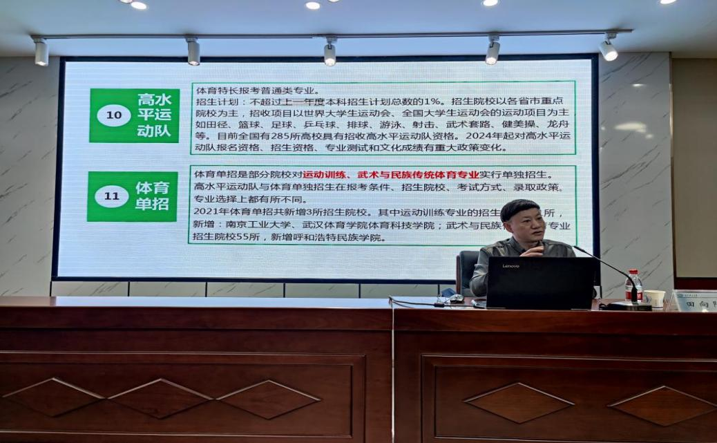 招生就业处副处长田向阳作《招生录取视角下多元升学途径解析》主题讲座,详细介绍了高考多元录取渠道以及如何运用生涯规划专业知识了解选科、专业与职业方向等内容。