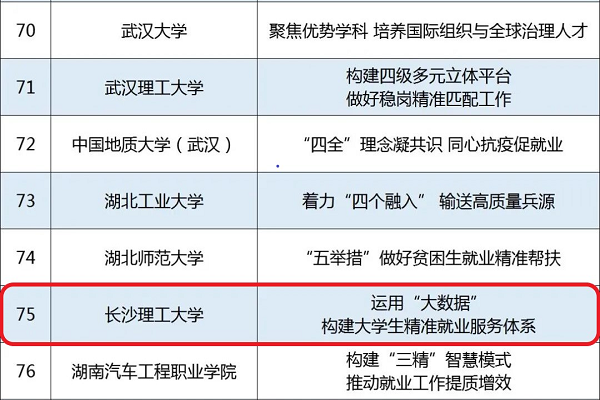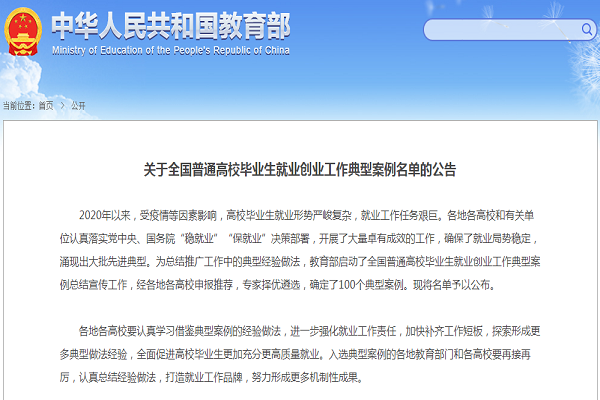 日前,教育部启动全国普通高校毕业生就业创业工作典型案例总结宣传工作,经各地各高校申报推荐,专家择优遴选,确定了100个典型案例。11月26日,教育部发布公告,公布了这100个典型案例名单,我校《充分运用“大数据”构建大学生精准就业服务体系》作为省内唯一本科院校入选。