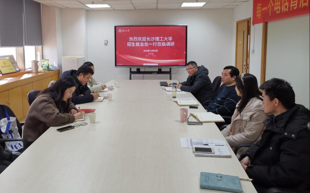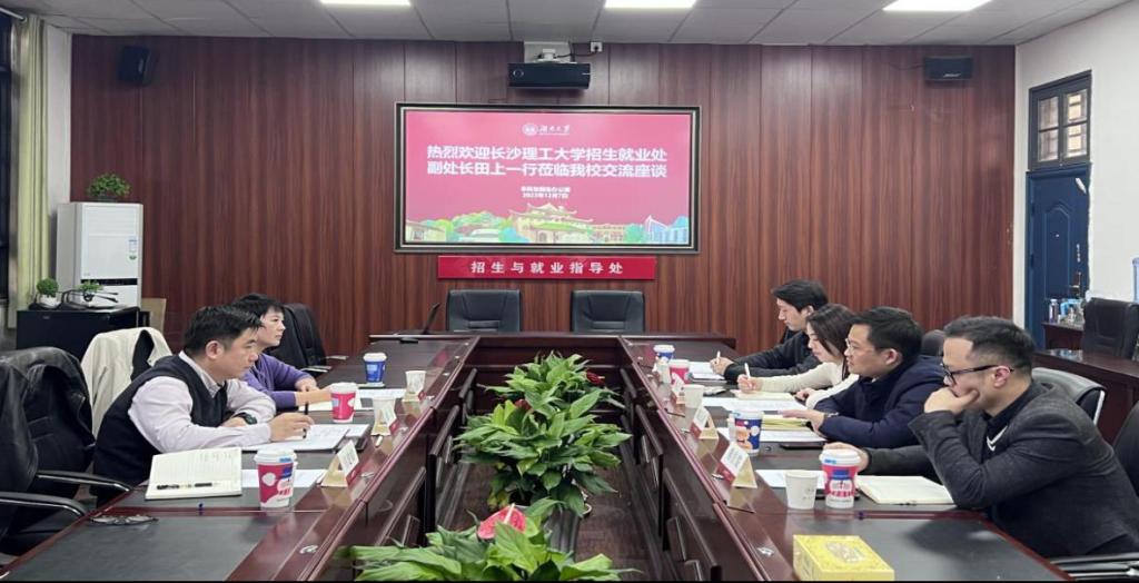 湖南大学是湖南高等教育的领头羊之一,也一直是我校招生宣传工作对标学校的对象。12月7日,调研组一行首先来到湖南大学学习交流。湖南大学学生工作部副部长陈沅灵及全体招办老师参加座谈。陈沅灵部长从录取信息系统建设、招生宣传队伍设置等方面介绍了湖南大学的工作情况,随后双方就招生宣传工作的具体做法、专业组设置、招生宣传考核体系建设等情况进行了深入交流。调研中,我校调研组还实地参观了湖南大学咨询场地和录取工作现场,并就今后在招生宣传活动中开展深度合作达成了一致。