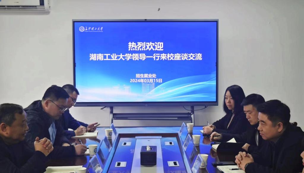 3月15日上午,湖南工业大学招生与就业指导处处长欧舟一行7人来我校调研。我校招就处处长田上及各科室负责人参加此次活动。