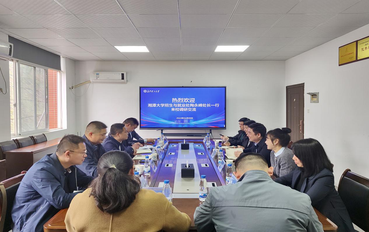 4月8日下午,湘潭大学招生与就业指导处处长陶永峰一行7人来校调研交流,我校招生就业处处长田上、副处长李娜及各科室负责人参加。