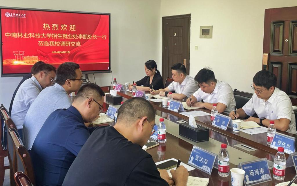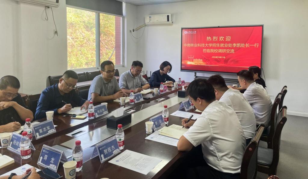 10月11日上午,中南林业科技大学招生就业处处长李凯一行7人来我校调研。我校招就处处长田上、副处长李焰及各科室负责人参加此次会议。