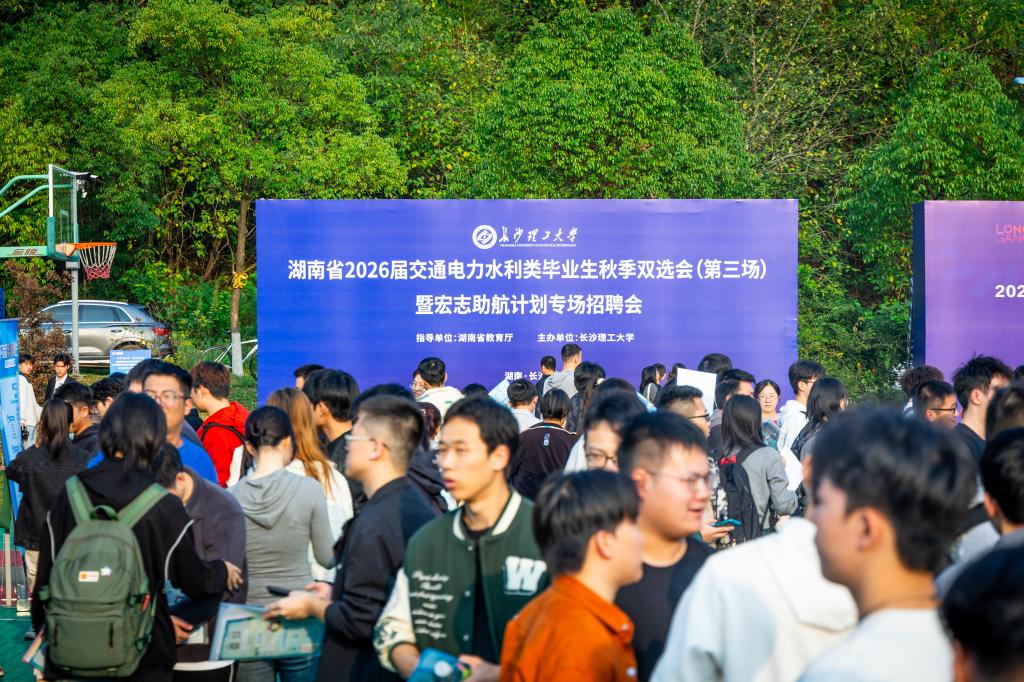 10月28日下午,湖南省2026届交通电力水利类毕业生秋季双选会暨宏志助航计划专场供需见面会(第三场)在我校云塘校区学生活动中心西侧篮球场成功举行。