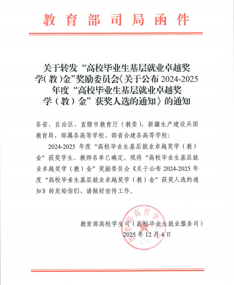 作为国内基层就业领域的权威激励奖项,“全国高校毕业生基层就业卓越奖学(教)金”核心聚焦基层贡献,重点表彰扎根一线就业创业并取得突出成绩的毕业生及优秀就业指导教师,对引导高校学子投身基层具有重要示范意义。2025年,全国共有418名(湖南省15人)优秀高校毕业生获此殊荣。