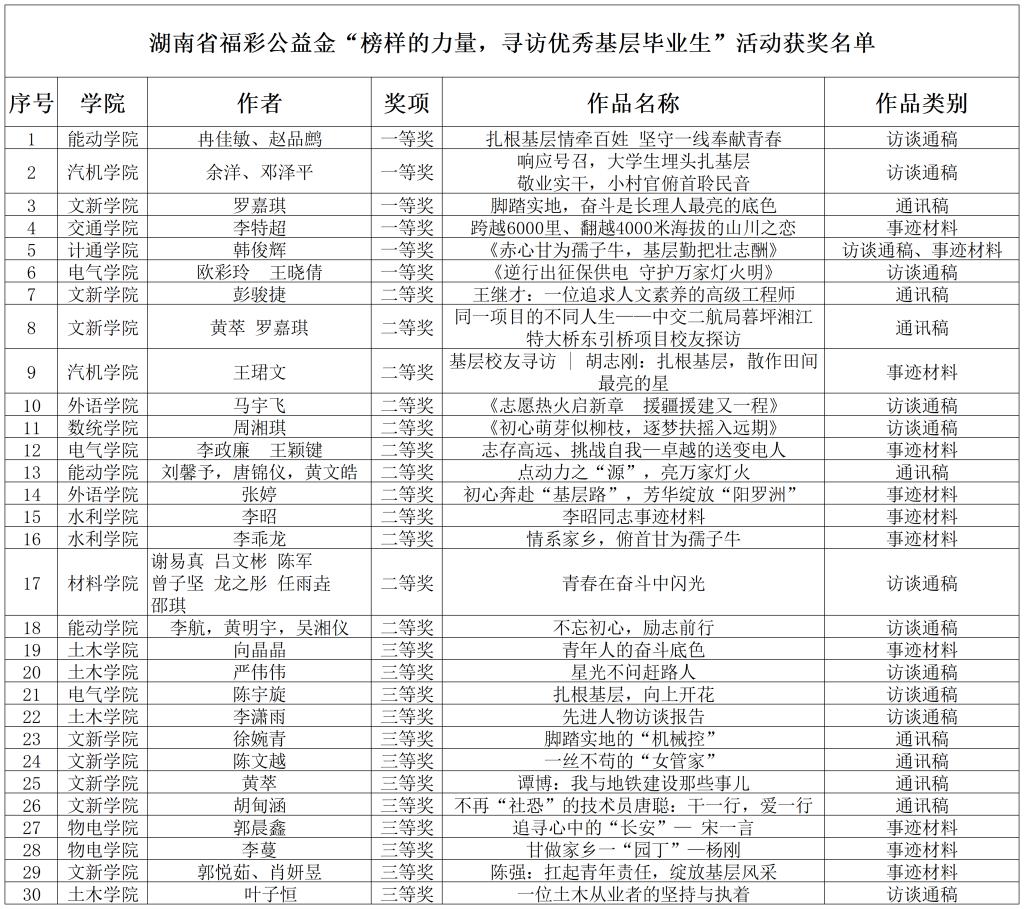 根据《关于开展湖南省福彩公益金“榜样的力量,寻访优秀基层毕业生”活动的通知》要求,全校师生踊跃参与活动,深入挖掘优秀基层毕业生资源。经学院择优推荐,学校专家评审,评选出一等奖6名,二等奖12名,三等奖10名,获奖名单公示如下: