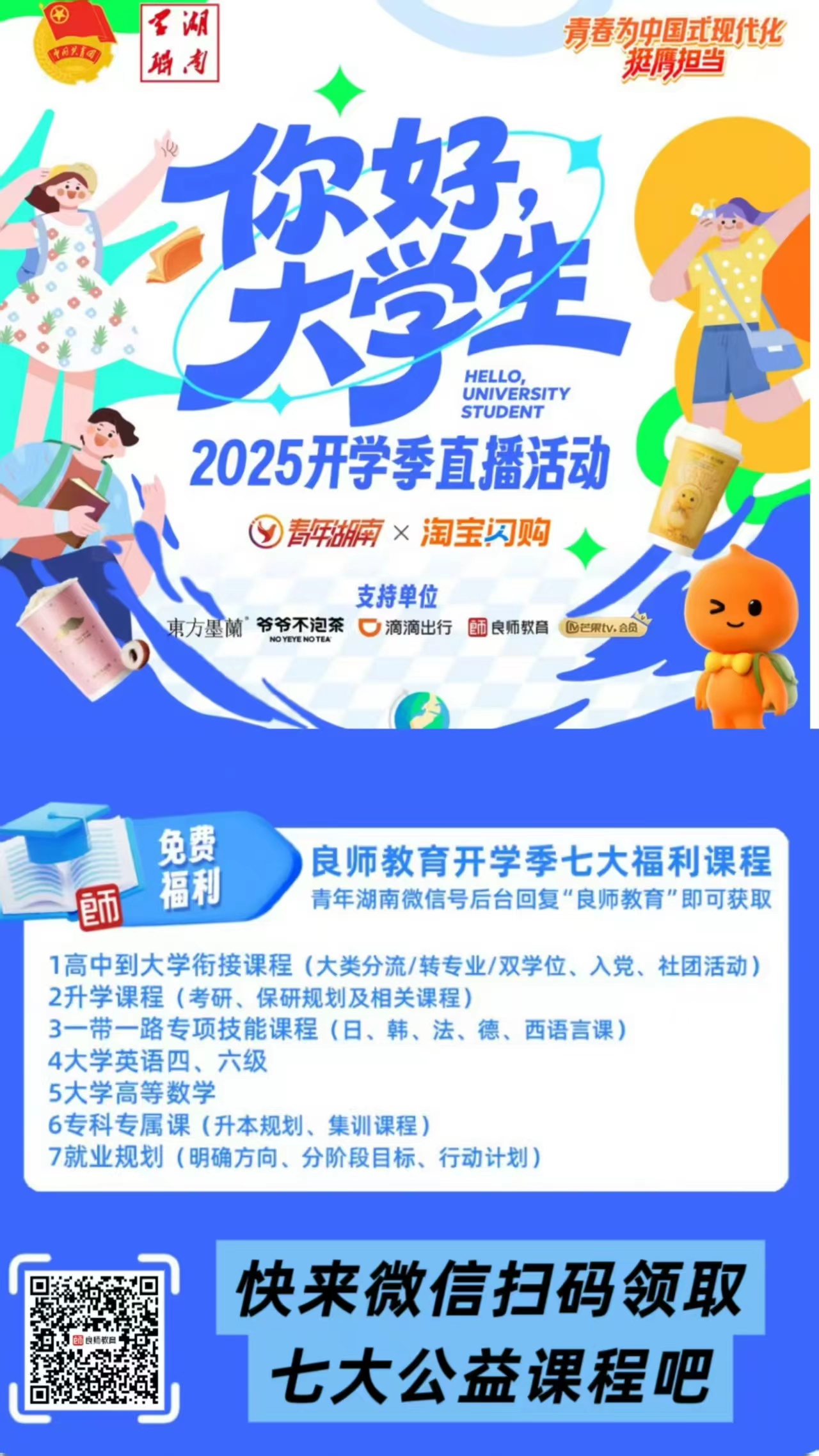 学期学习惊喜从领取公益课程大礼包开始!此活动由青年湖南主办,良师教育支持,为帮助学生更好适应学校、形成良好学习习惯,将给大家带来开学季福利课程: